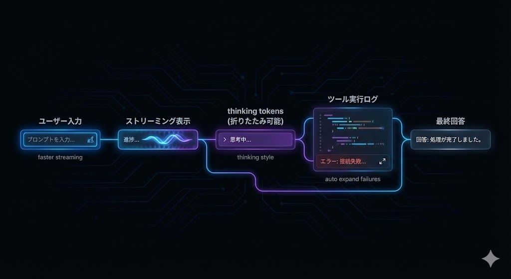 応答のストリーミングがより速く、モデルの推論(“thinking”)が視覚的に追えるようになり、単なるテキスト結果よりも「AI の思考プロセス」を開発者が把握しやすくなりました。この可視化は、提案内容の意図理解やデバッグ支援で効果を発揮します。