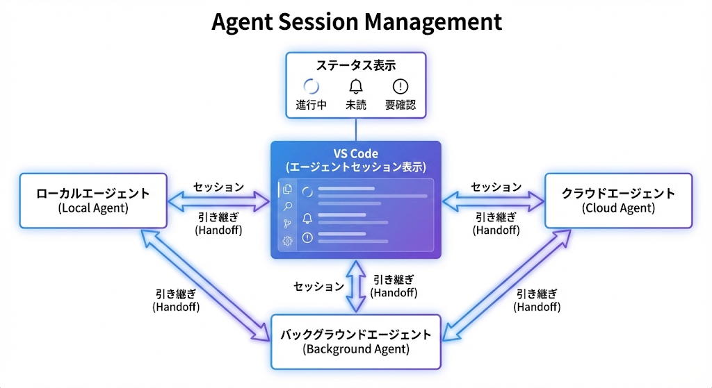 1.109 の Agent Session Management は、VS Code を “multi-agent development のホーム”にする、というリリースの主題そのものです。ローカル、バックグラウンド、クラウドなど環境をまたいだ複数セッションを、単一のビューで扱い、必要なときに人間が途中から介入できるようにする。ここが設計思想として明確です。