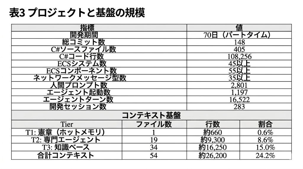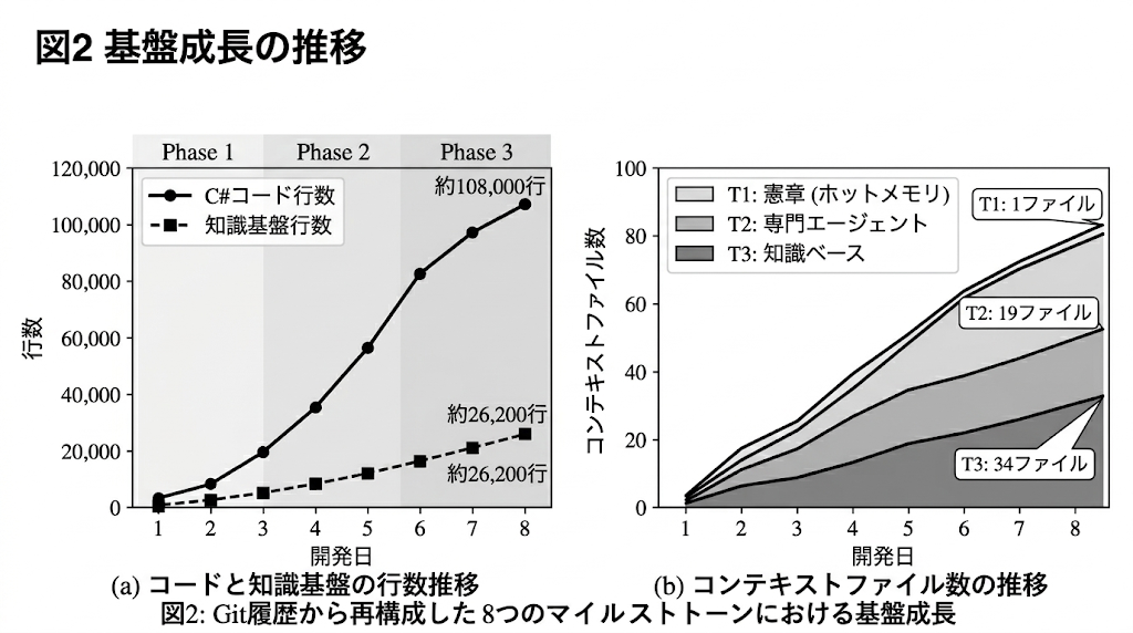 283回の開発セッションにわたる基盤の成長と相互作用パターンの定量指標を報告し、さらに、コード化コンテキストがセッションをまたいで伝播し、失敗防止と一貫性維持に寄与したことを示す4つの観察事例を示す。この枠組みは、オープンソースのコンパニオンリポジトリとして公開されている。