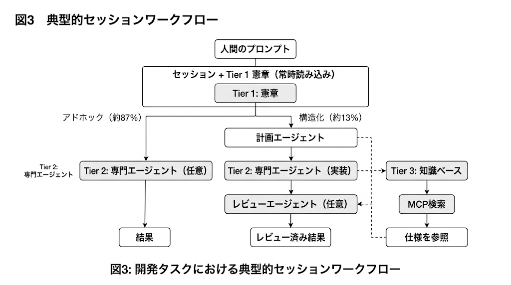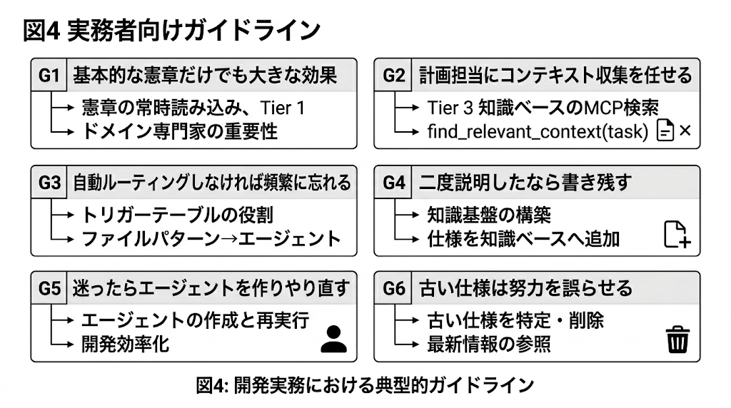 憲章は、各AIセッションに自動的に読み込まれる単一のMarkdownファイルである。そこでは、コード品質基準、命名規約、ビルドコマンド、Tier 3 の詳細仕様への参照を伴うアーキテクチャパターン要約、一般的操作のチェックリスト、既知の失敗モード、そしてタスクを専門エージェントへ振り分けるオーケストレーション・プロトコルが定義される。