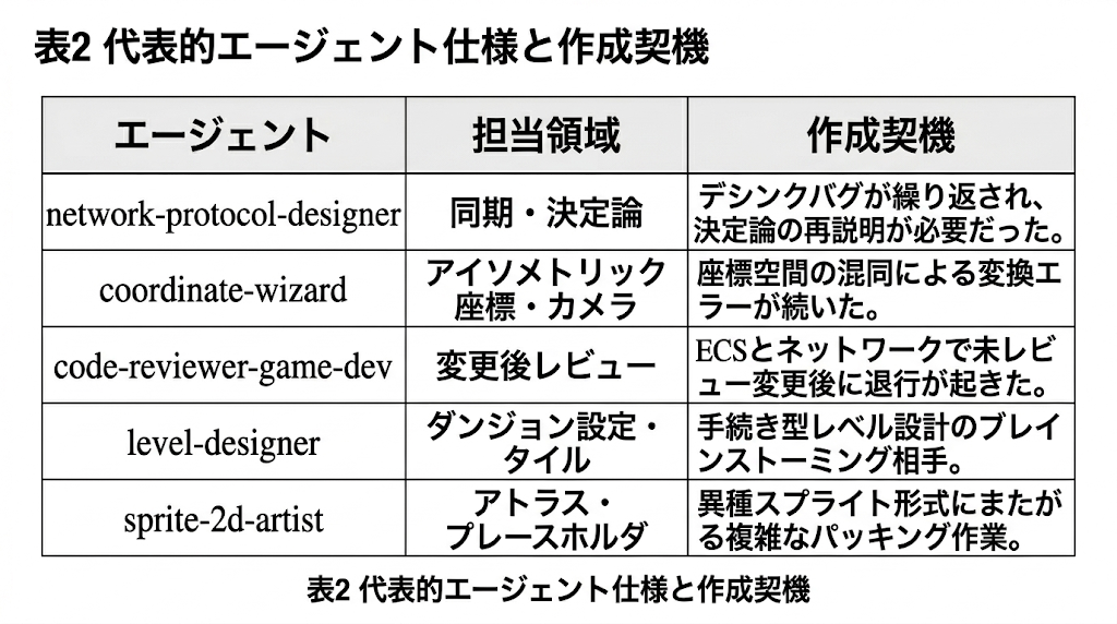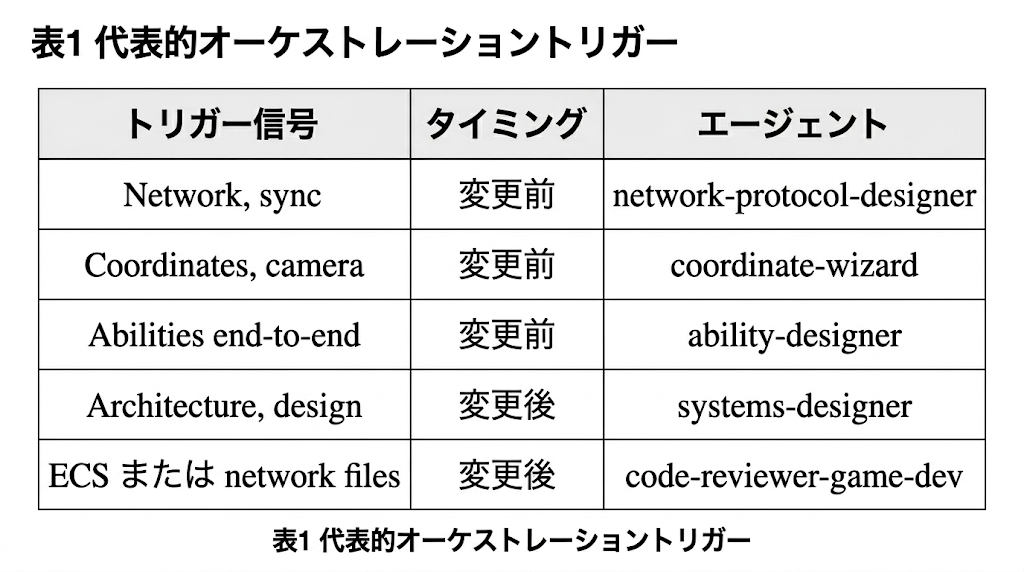 憲章には、主としてどのファイルが修正されるかという観測可能なシグナルに基づいて、タスクを適切な専門エージェントへルーティングするトリガーテーブルが埋め込まれている。たとえば、ネットワークや同期の変更前には network-protocol-designer、座標やカメラの変更前には coordinate-wizard、能力のエンドツーエンド変更前には ability-designer、アーキテクチャや設計変更後には systems-designer、ECSまたはネットワークファイルの変更後には code-reviewer-game-dev を呼び出す。