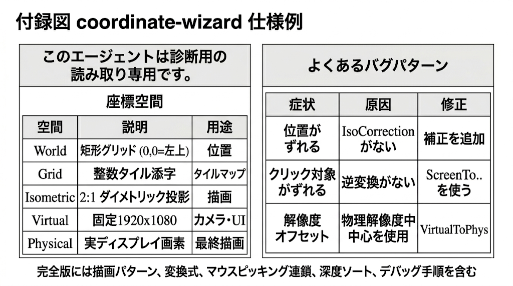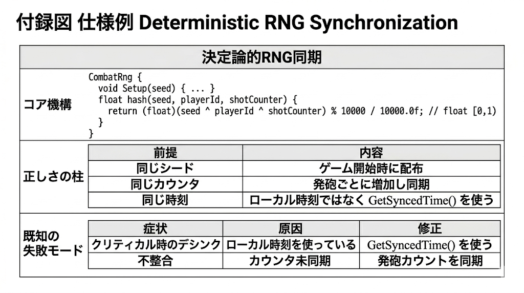 network-protocol-designer エージェントの仕様には、正しさの柱、ハッシュ関数制約、既知の数値エッジケースといったプロジェクトの決定論理論が埋め込まれている。この埋め込み知識に基づき、エージェントは、それまでの5回の試行をすり抜けていた3つの問題を同定した。正常条件下で静かに失敗するガード節、異なるレートで更新される2つの内部クロック、そして時計補正式の符号誤りである。さらにエージェントは、戦闘RNGハッシュの入力に時刻を使うこと自体が本質的に逆効果だと結論した。時間バケット・パラメータを同期済みショットカウンタへ置き換えたことで、このバグは解消された。